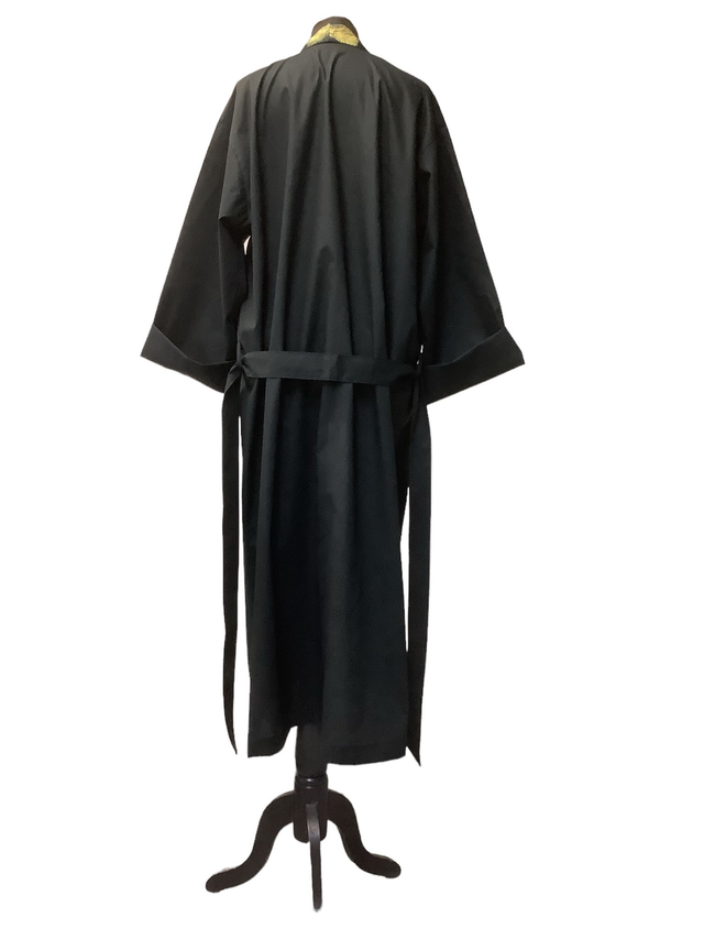 This luxurious piece features a stunning hand block printed Peacock Feathers design with accents of gold shimmer on a black background. Made in soft and fluid 100% cotton poplin it is perfect for adding a touch of glamour to your at-home wardrobe or for layering over your favorite outfit for a night out.