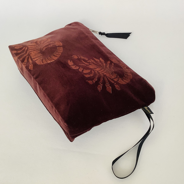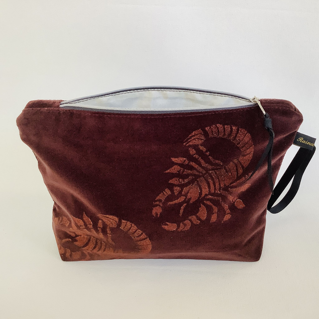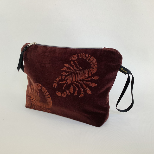 Introducing our exquisite Chocolate Brown Scorpio velvet Wash Bag Wash Bag. This captivating wash bag made in luxurious chocolate brown 100% cotton velvet features copper Scorpio design.