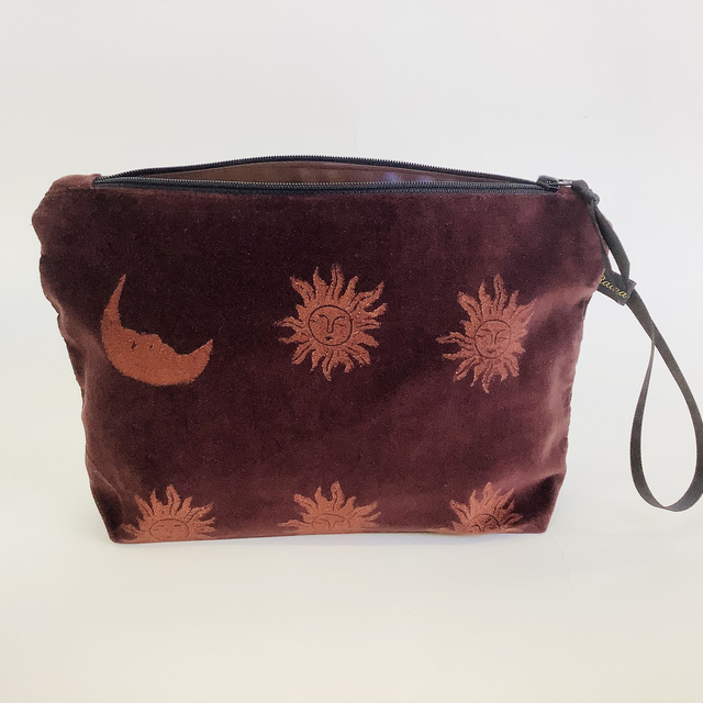 Introducing our exquisite Chocolate Brown Sun and Moon Wash Bag. This captivating wash bag made in luxurious chocolate brown 100% cotton velvet features copper Sun and Moon design.