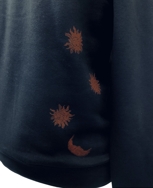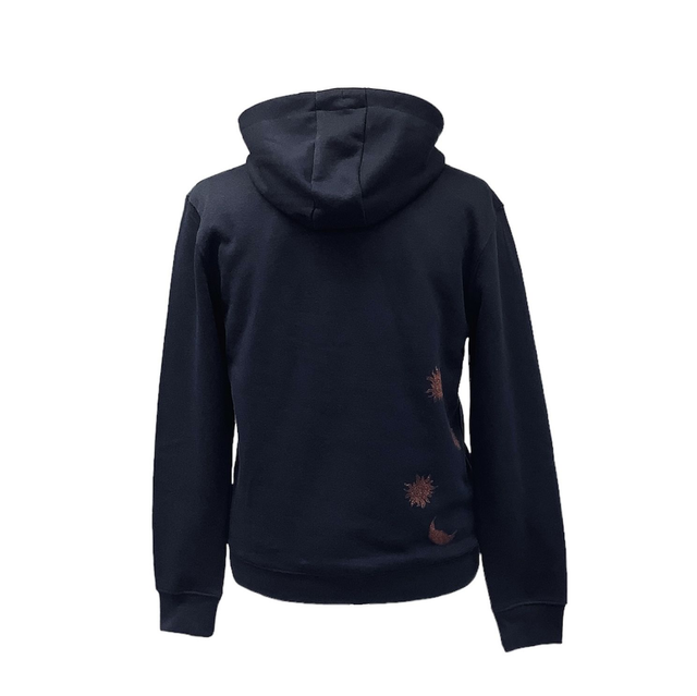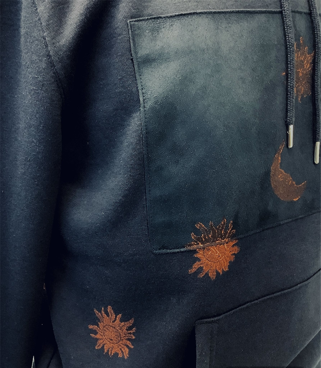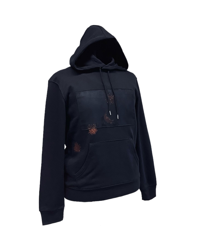 Navy jersey hoodie with black brushed suedette front panel featuring Sun and Moon handprinted graphic art print.