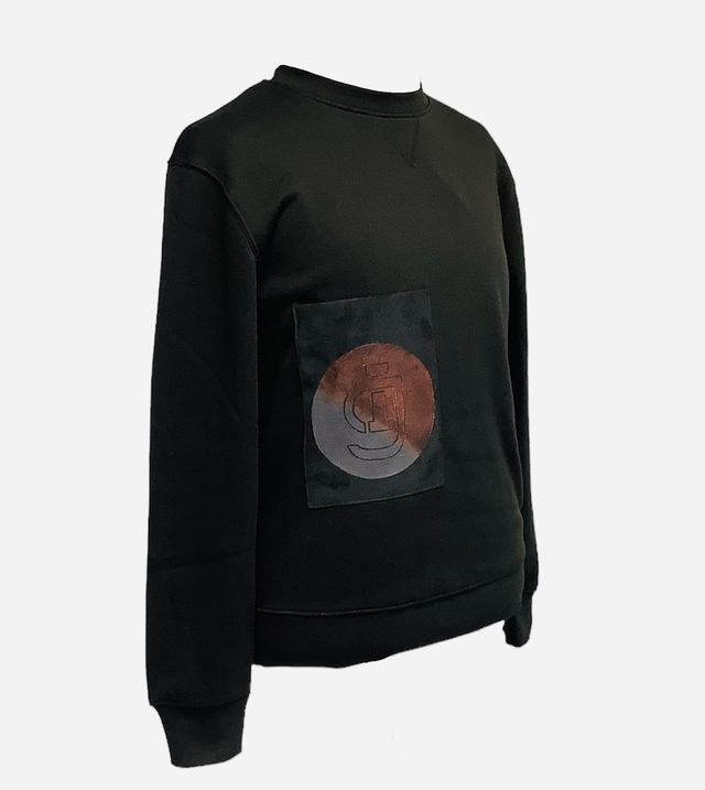 Black jersey sweatshirt with black brushed suedette front patch pocket centered featuring Muśe Logo copper and grey gradient handprinted graphic art print.