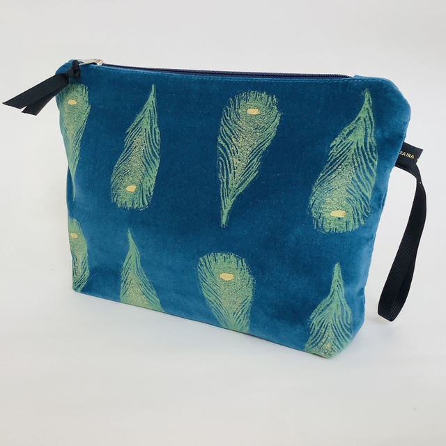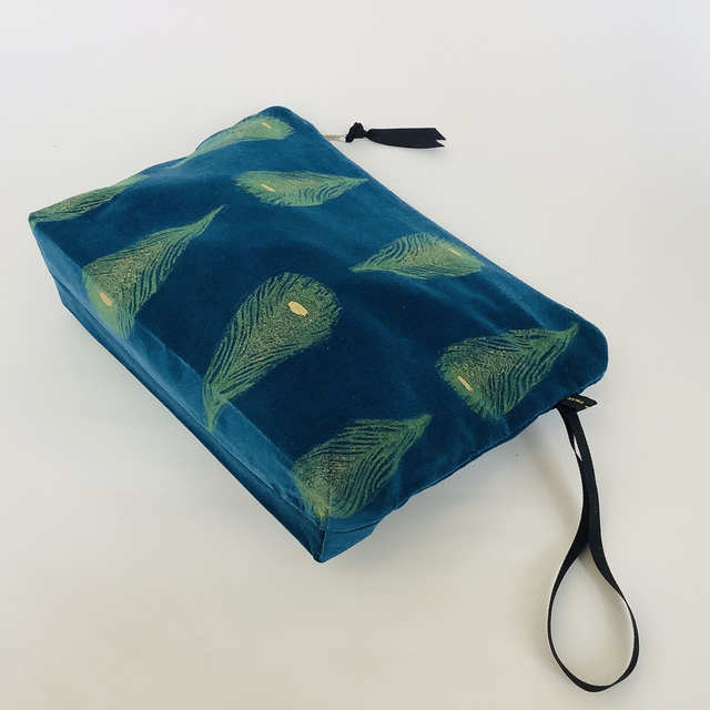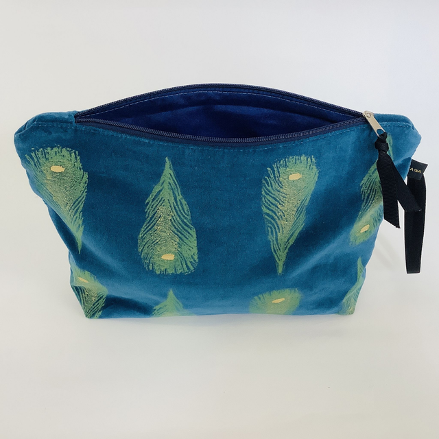 Introducing our exquisite Teal Peacock Feathers Wash Bag. This captivating wash bag made in luxurious teal 100% cotton velvet features Peacock Feathers design.