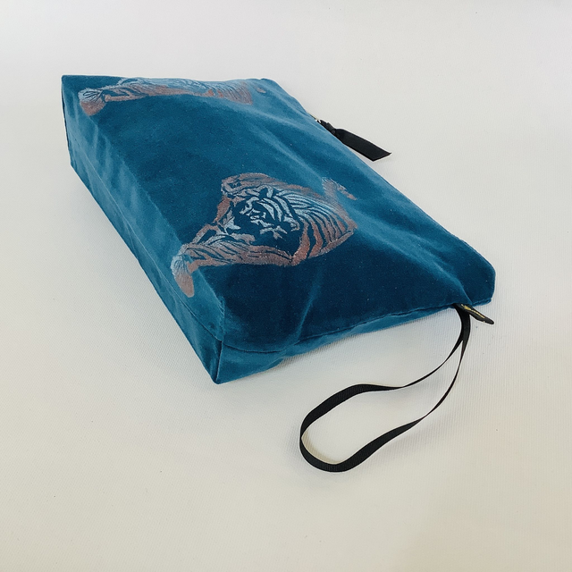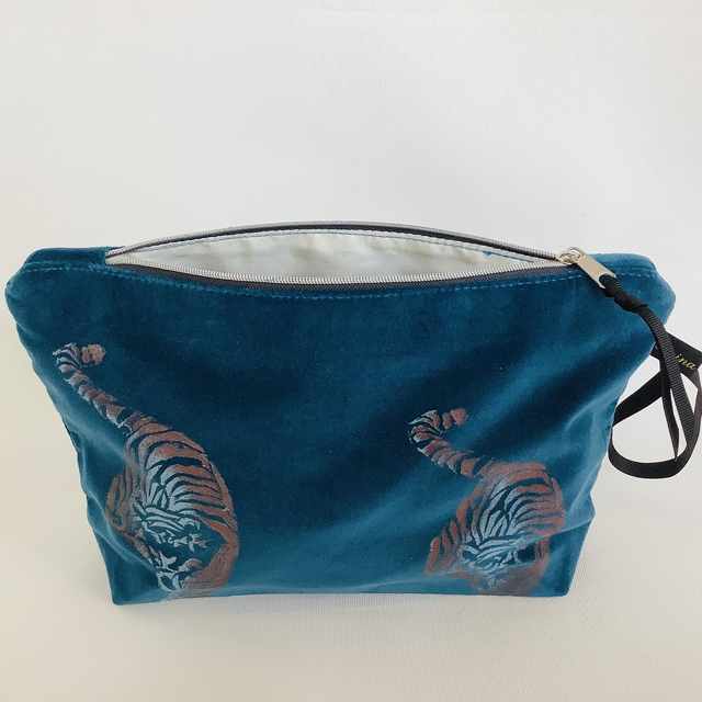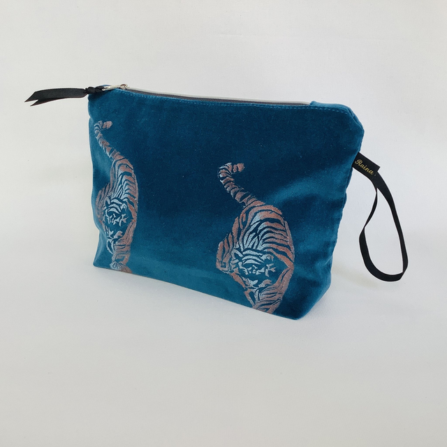 Introducing our exquisite Teal Tiger Wash Bag. This captivating wash bag made in luxurious teal 100% cotton velvet features Teal Tiger design.